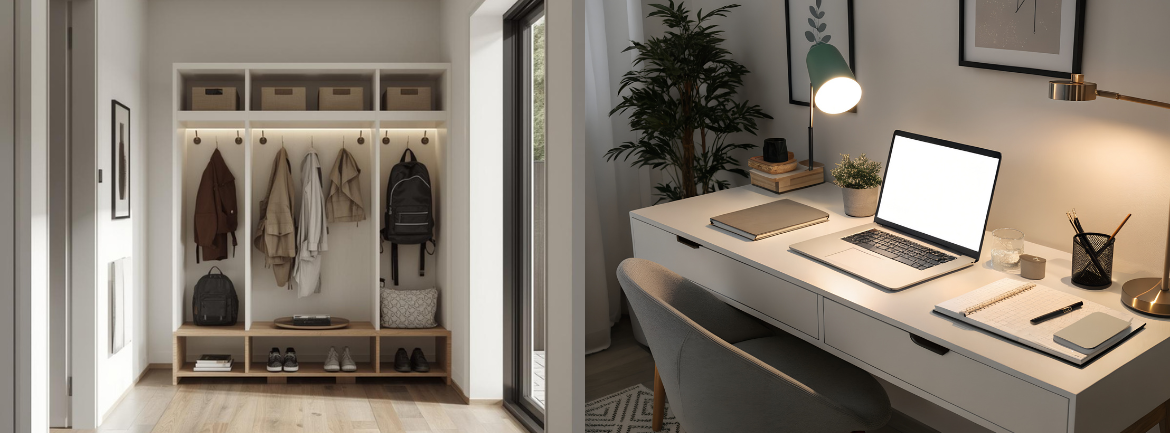 If mornings feel chaotic, your entryway is your best friend. Set up a simple drop zone where school essentials live: